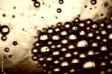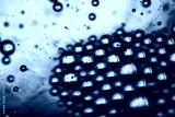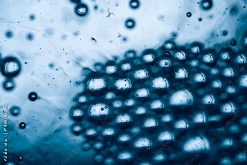 Macro shot of blue water bubbles forming dense cluster on surface with soft ripples and light reflections in background.