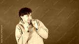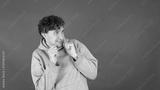 Young adult curly unhappy man suffers panic attacks, twitches sounds, movements. Isolated red background studio shot. Concept - phobia, fears, paranoia, persecution mania.