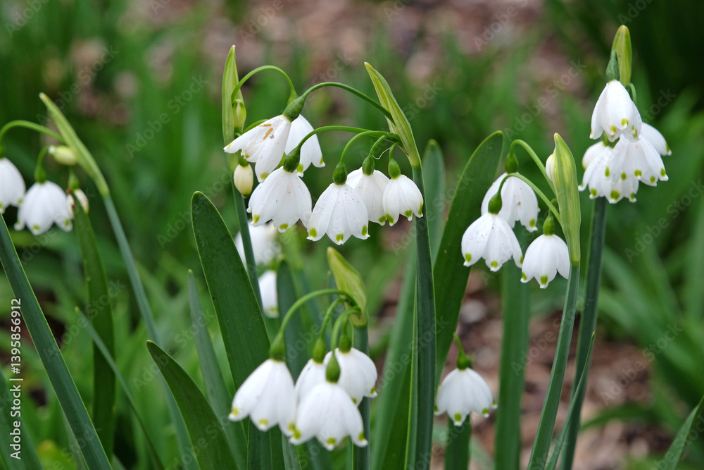 White Leucojum ‘Gravetye Giant’, also known as snowflakes, in flower.