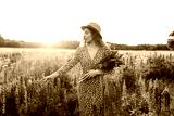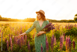 Beautiful woman with a bouquet of wild flowers enjoys the sunset outdoors. A young woman walks through a field with a bright bouquet of flowers. The concept of beauty, relaxation. Lifestyle.