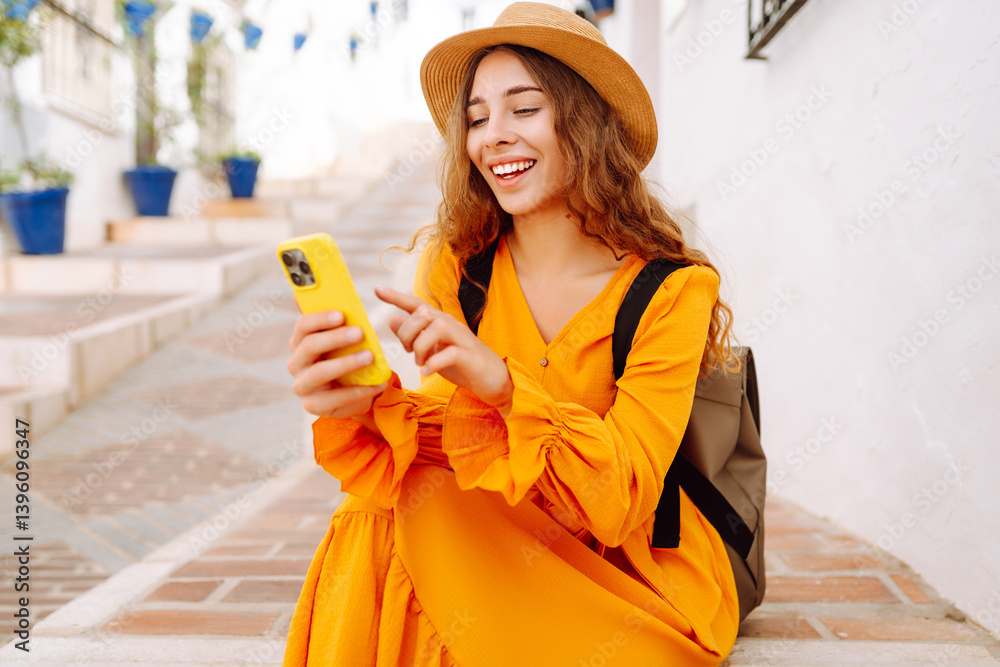 Beautiful tourist in hat and backpack with texting or blogging with phone in hands outdoors. Young woman with phone enjoying travel or vacation, walking along streets.