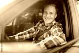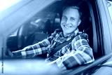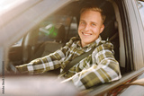 A young man driving a car in a checkered shirt enjoys the sunny weather. Driving, transport, travel concept.