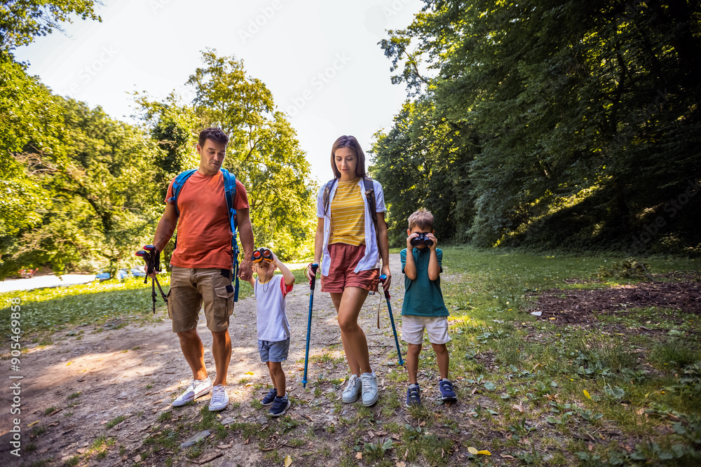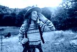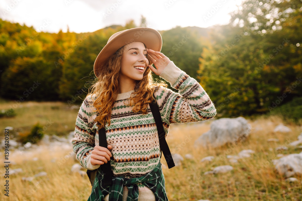 Woman traveler in hat feeling free, enjoying sunny weather in mountains on trail. Wanderlust. Travel, vacation concept. Active lifestyle.