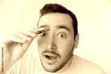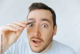 Man focuses on detailed grooming by removing eyebrow hair with tweezers