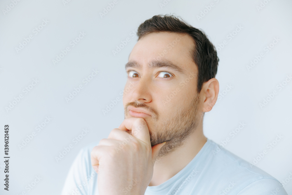 Man displaying a thoughtful expression in a bright, minimalist setting