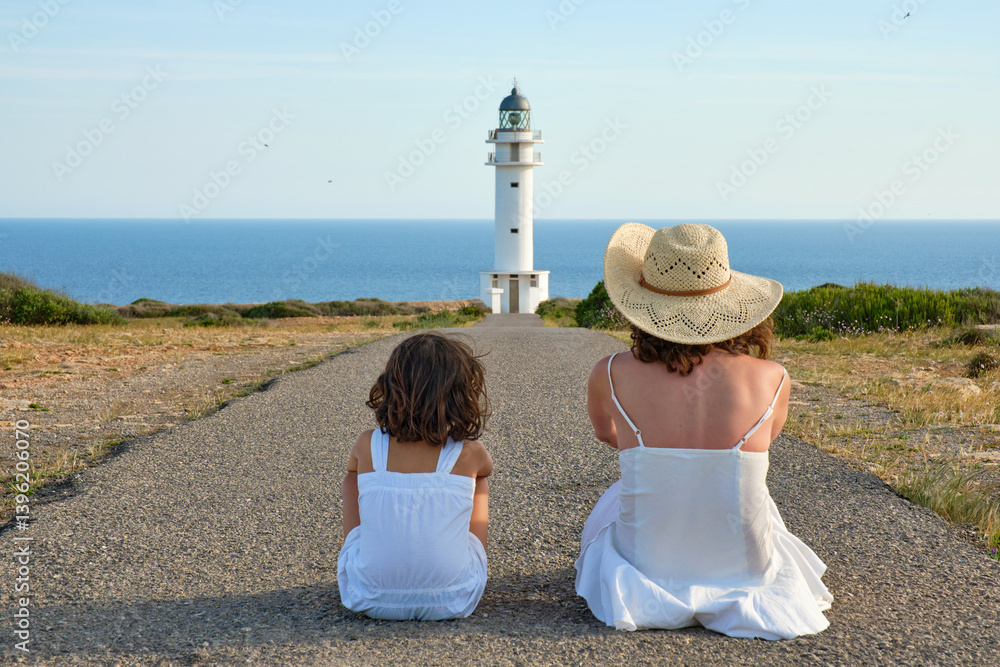 Mother and daughter in white dresses sitting by the sea with lighthouse at sunset
