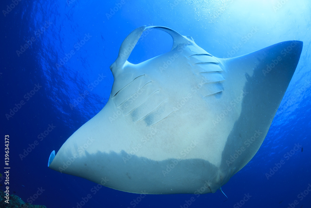 Manta Ray comes to cleaning station. Manta ray swims over coral reef with fish