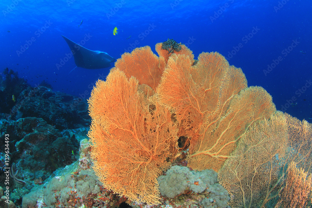 Manta Ray comes to cleaning station. Manta ray swims over coral reef with fish