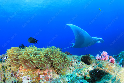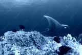 Manta Ray comes to cleaning station. Manta ray swims over coral reef with fish