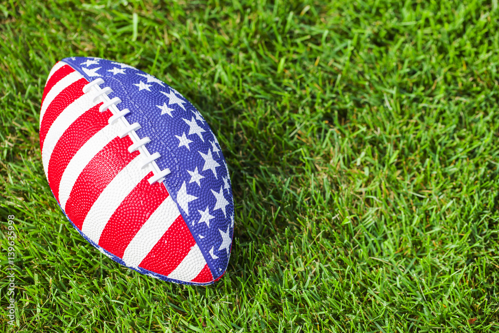 Close-up of rugby ball with stars and stripes on grass. Independence Day souvenir