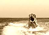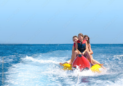 People ride on banana boat