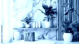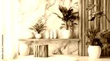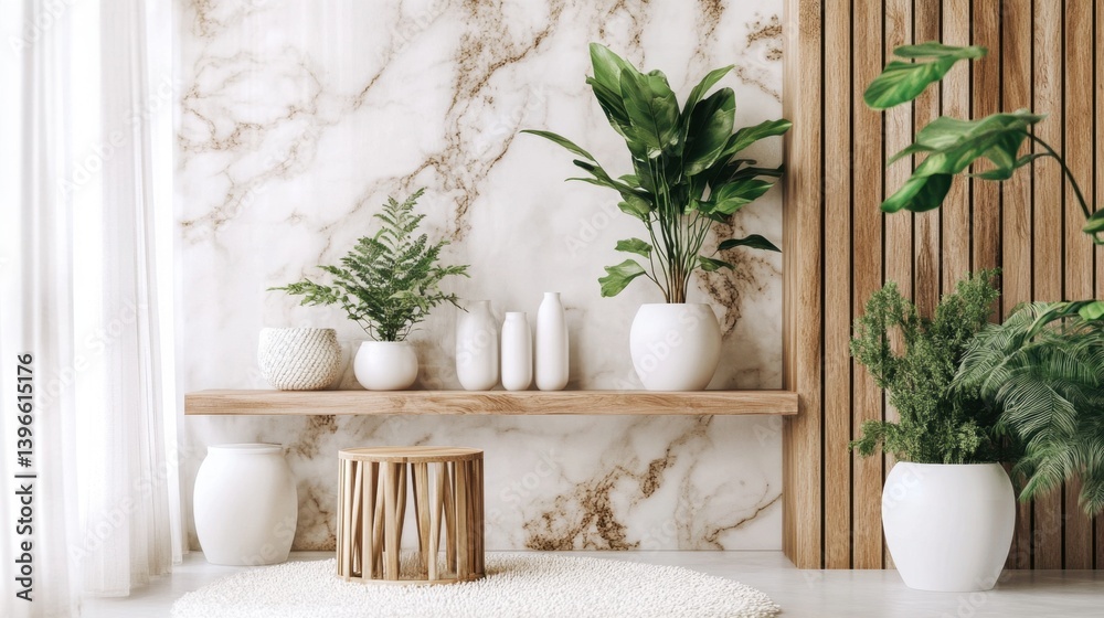 Bright, modern interior with lush greenery displayed on a wooden shelf and floor. Marble wall and soft rug create a serene atmosphere