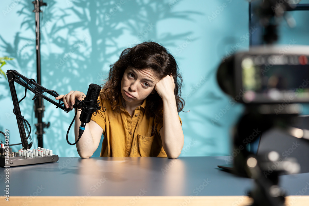 Streamer feeling upset, sharing concerning story during live broadcast, talking to audience. Annoyed media star talking with viewers, ranting and arguing with subscribers online