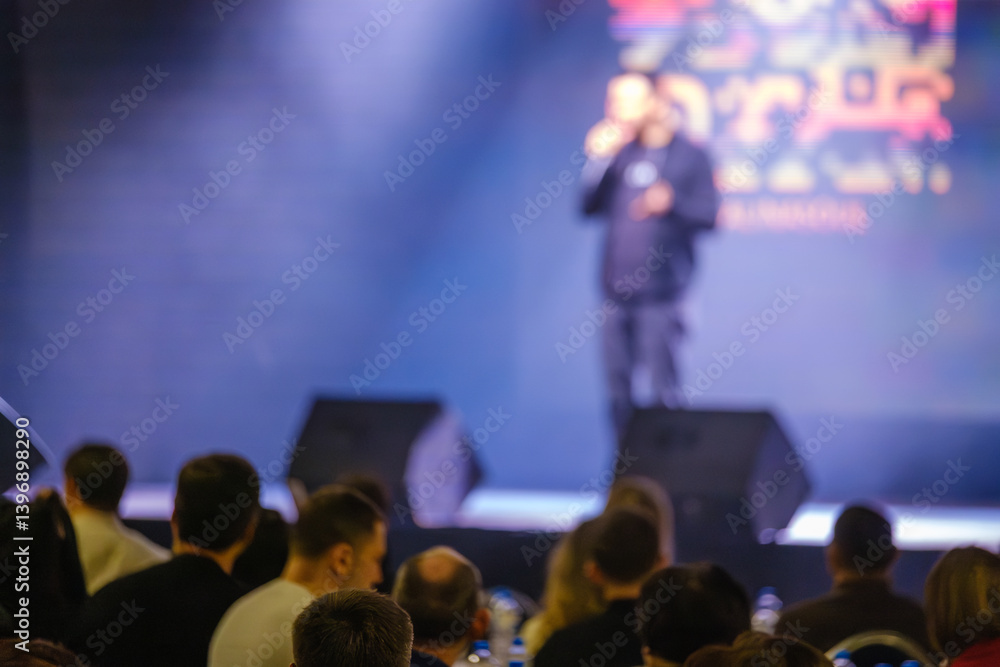 Blurry speaker on stage with an audience seated and focused on the event