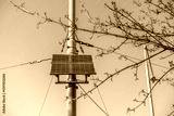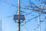 Solar panel installed on street pole with electric wires and tree branches on clear blue sky background, sustainable urban energy infrastructure