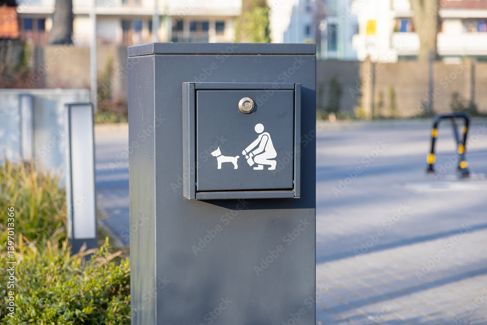 Public pet waste bin with dog cleanup symbol on urban street encouraging responsible pet ownership and clean environment awareness