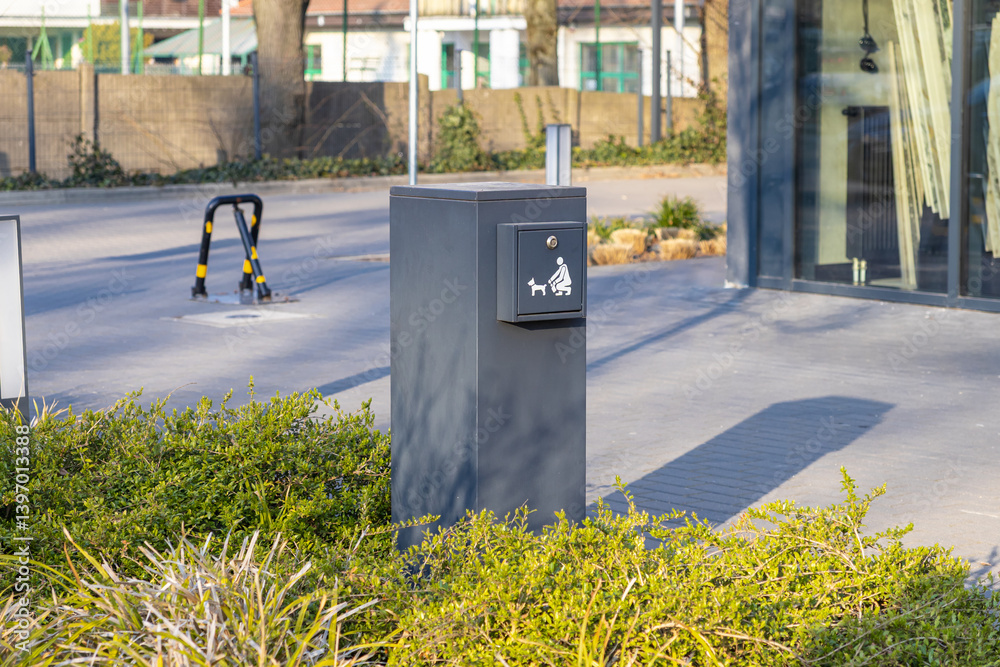 Modern dog waste disposal box in urban environment promoting pet cleanliness and responsible dog ownership near public sidewalk and greenery