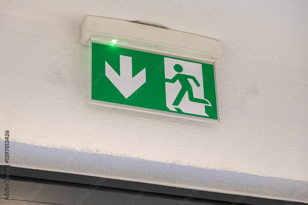 Emergency exit sign with downward arrow and running man icon, green and white evacuation direction indicator on interior wall above doorway in modern building