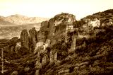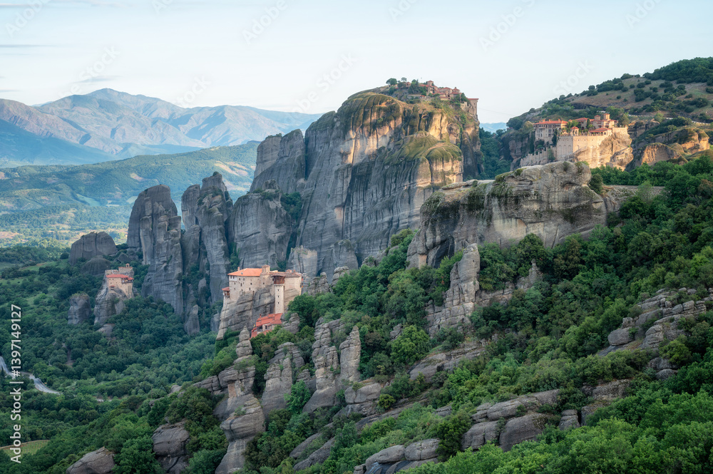 Amazing panoramic view with Varlaam Monastery, Monastery of Great Meteoron and Monastery of St. Nikolaos in the Meteora Valley near Kastraki, Greece