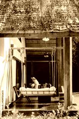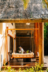 Resort housekeeper cleaning the wooden patio of a tropical beach bungalow with swing and palm shadows. Summer sunny atmosphere in island accommodation