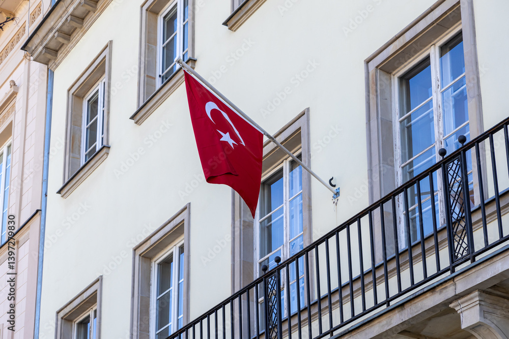 Turkish national flag hanging on pole outside window of historic European-style building in daylight