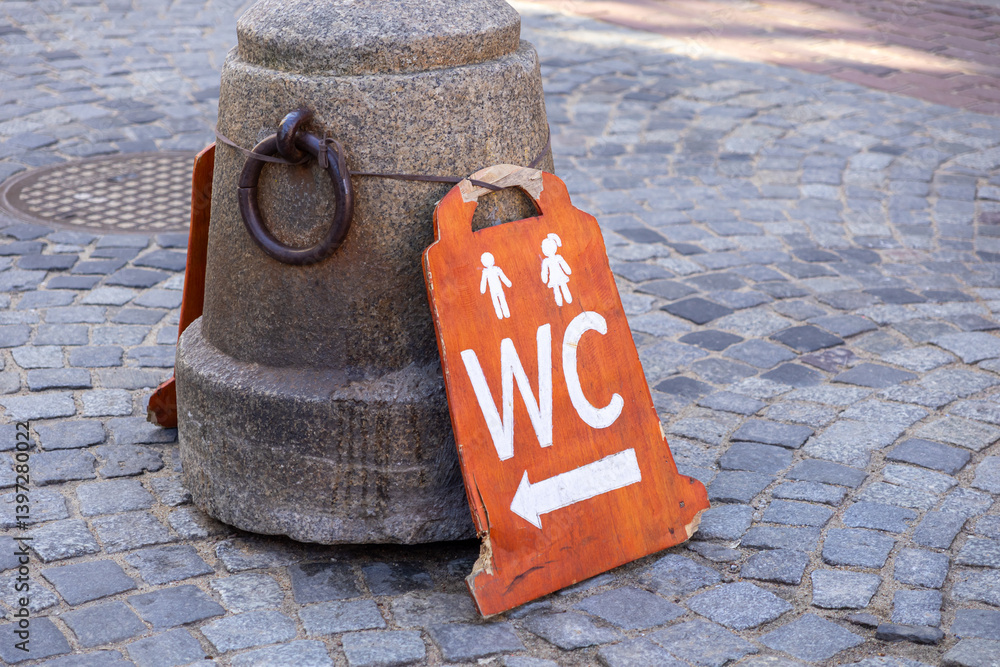 Handmade wooden WC sign with male and female icons and arrow leaning against stone post on old cobblestone street