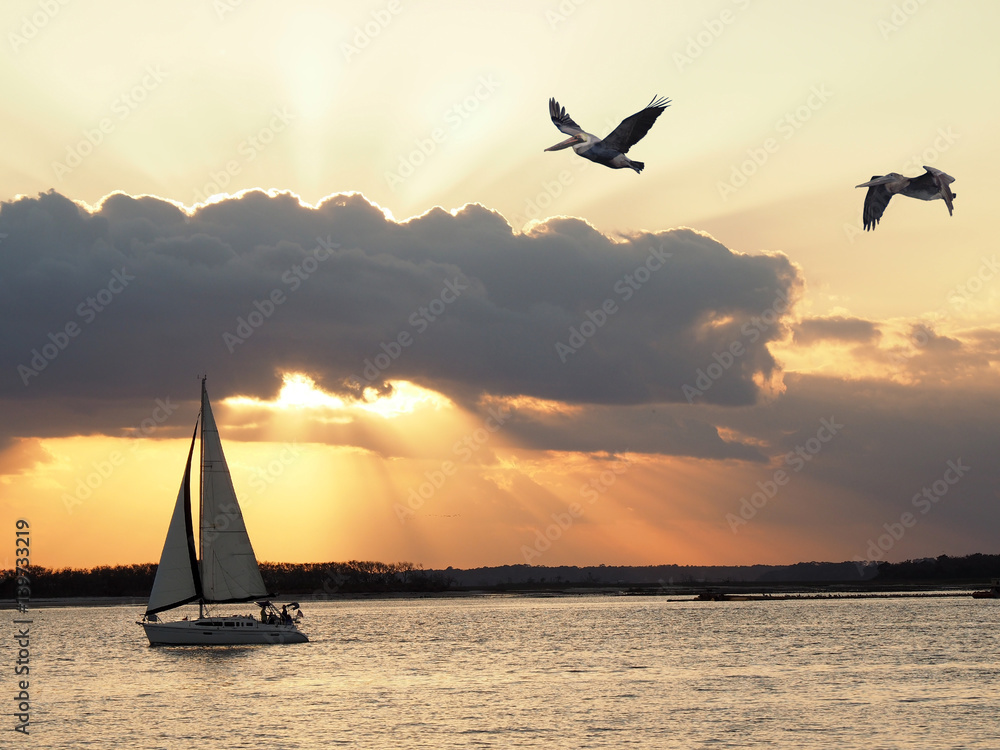 Sailboat Sails By as the Sun Sets and Pelican Fly