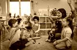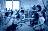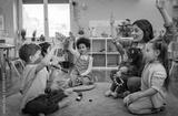 Happy kindergarten teacher and a diverse group of children raising their hands together during music time in a bright classroom.