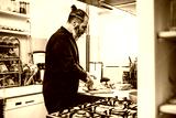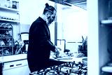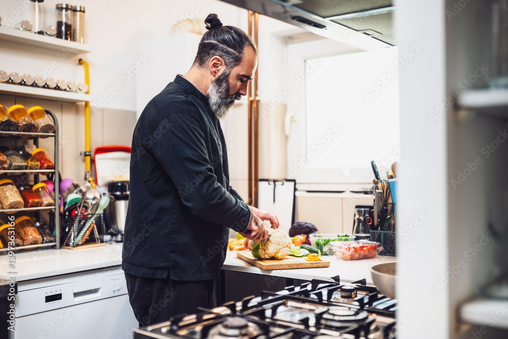 Professional chef is preparing meal in restaurant's kitchen. He makes a vegetarian lunch.