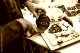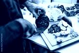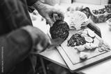 Close up of professional chef preparing ingredients for vegetarian meal in restaurant's kitchen. He is cutting cabbage.