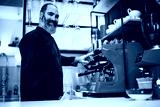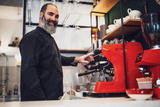 Professional barista in black apron working in restaurant. Portrait of happy barmen who is making coffee in his bar.