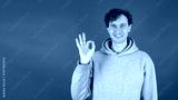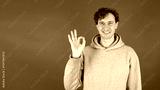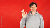 young, cheerful, curly haired brunette man in gray hoodie shows an ok sign with outstretched fingers. Isolated on red studio background. concept - approval, consent, confident choice.