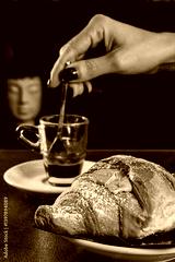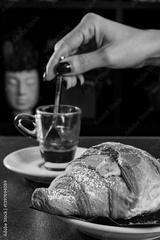 Cornetto ripieno al pistacchio con zucchero a velo e caffè espresso napoletano serviti in un bar per colazione