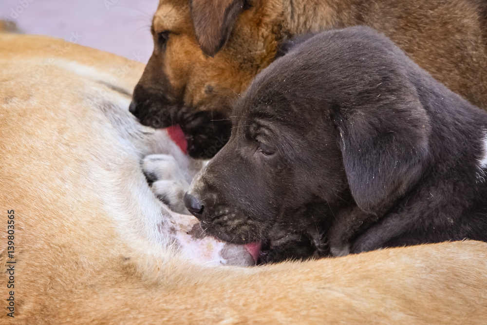 Two puppies suckling at their mothers nipples, Ranakpur, Rajasthan, India