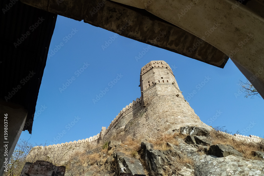 Fortification tower and wall of Kumbalgarh Fort, an impressive big Mewar fortress in Rajasthan, India