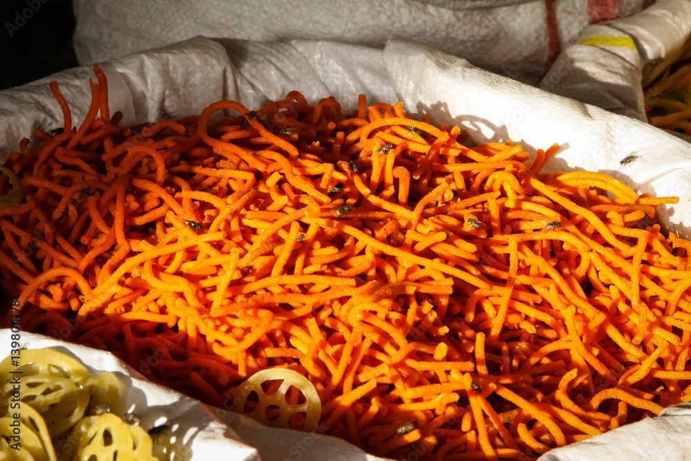 Bag of orange noodles full of flies in the light on a market in Jodhpur, Rajasthan, India