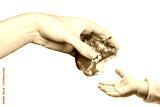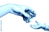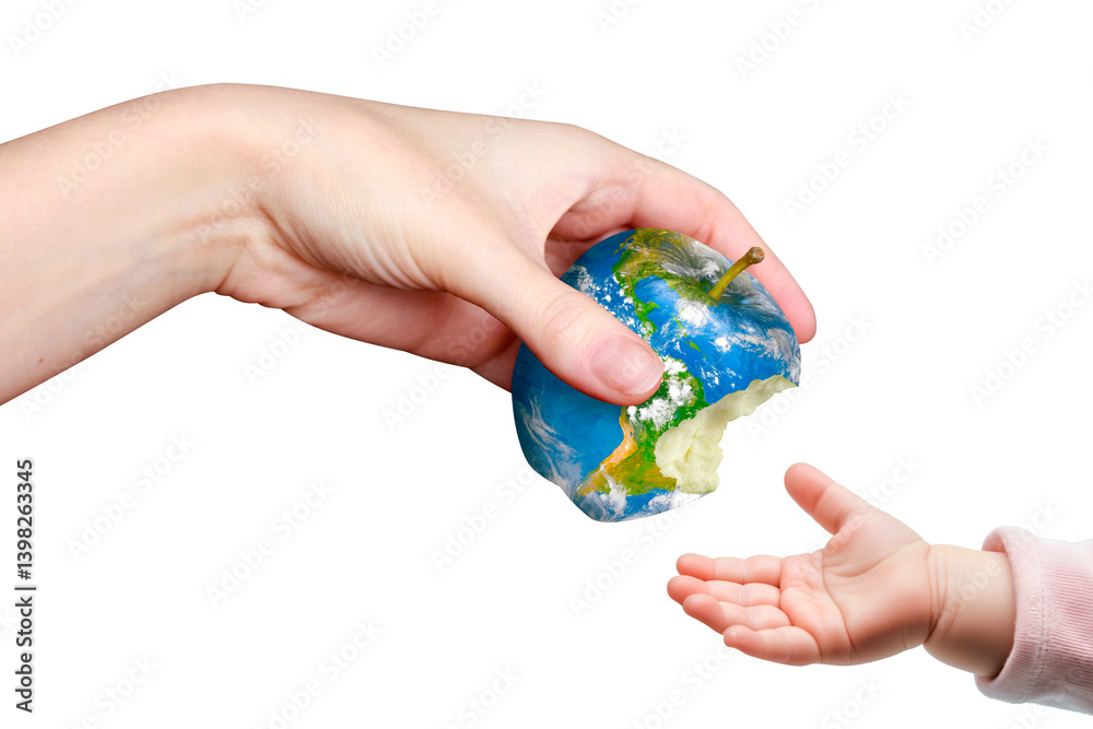 Planet Earth in the shape of an apple. An adult passes a bitten apple to a child. International Mother Earth Day. Ecology. Climate change. Eco-friendly. Environment. World. April 22