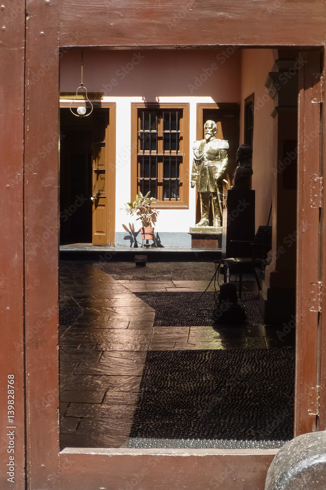 View through door to a light-flooded patio with sculpture in a colonial building, Lima,Peru