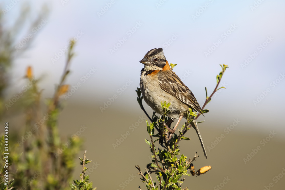 Rufous collared sparrow perching on a branch, Colca Canyon, Peru