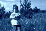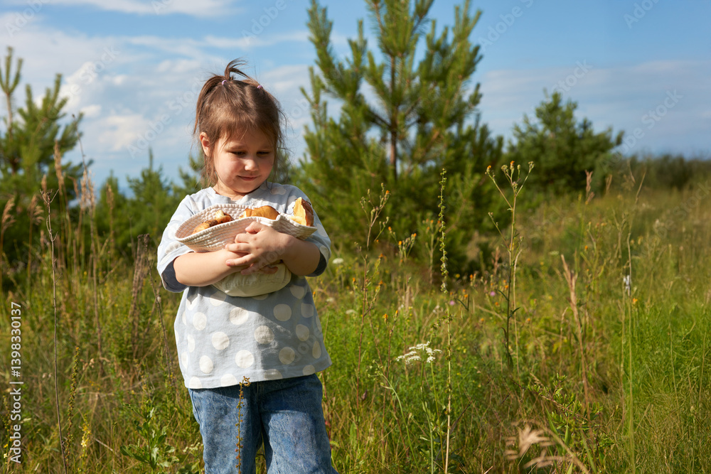 A little girl in the grass with a bunch of collected mushrooms in a panama, taken off her head, in her hands on the background of a picturesque pine grove.