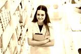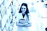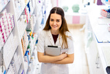 Portrait of professional smiling healthcare worker in the pharmacy store holding the tablet.