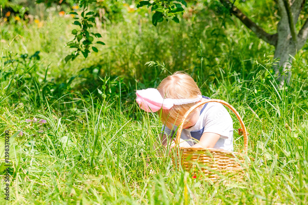 Easter egg hunt.Little boy child kid in bunny ears picking up eggs in grass,garden.Easter holiday tradition.Baby with basket full of colorful eggs