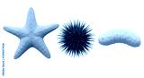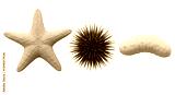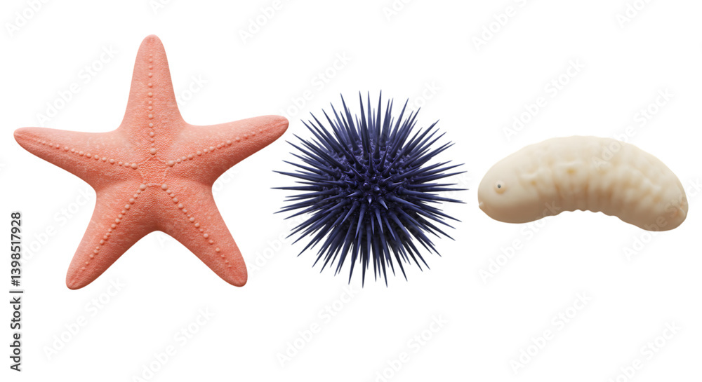 A starfish, sea urchin, and sea cucumber arranged horizontally on a black background in a studio shot