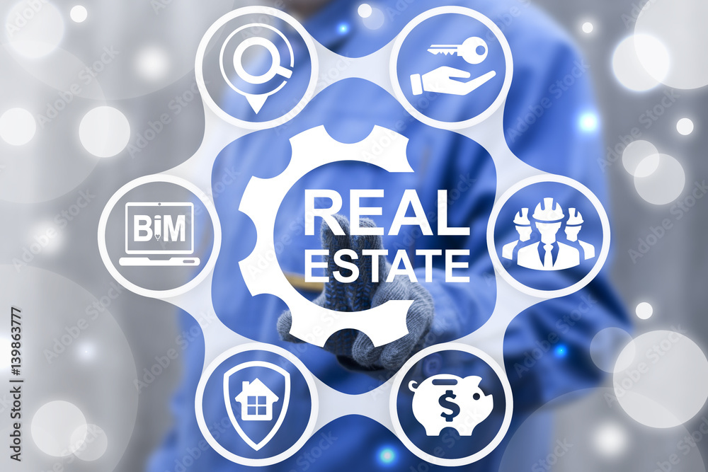 Property business service concept. Man touched real estate gear word icon on virtual screen. Building house, BIM, home for sale. Apartment renovation. Architecture, designing build technology