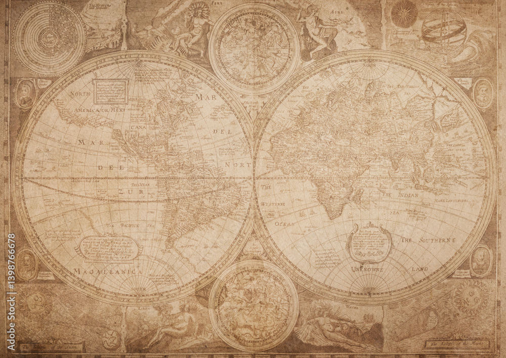 Old map of the world of the 18 century. Collage. A good background for design on the theme of travel, geography, history, voyage, etc.