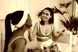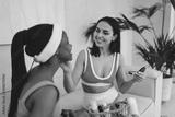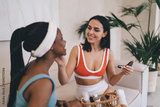 Moment of happiness featuring two female friends doing beauty routines in spa interior showcasing natural companionship, cheerful diverse women doing makeup together smiling during weekend leisure