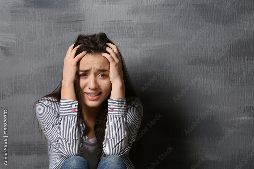 Depressed young woman on grey wall background