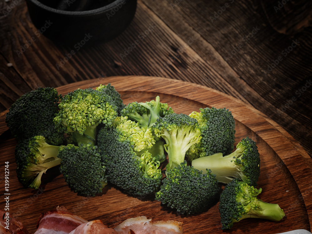 Raw rolls of turkey bacon on a wooden plate. Broccoli.
