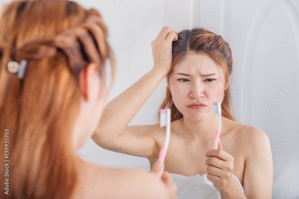 unhappy woman in bath towel brushing teeth with mirror in bathroom