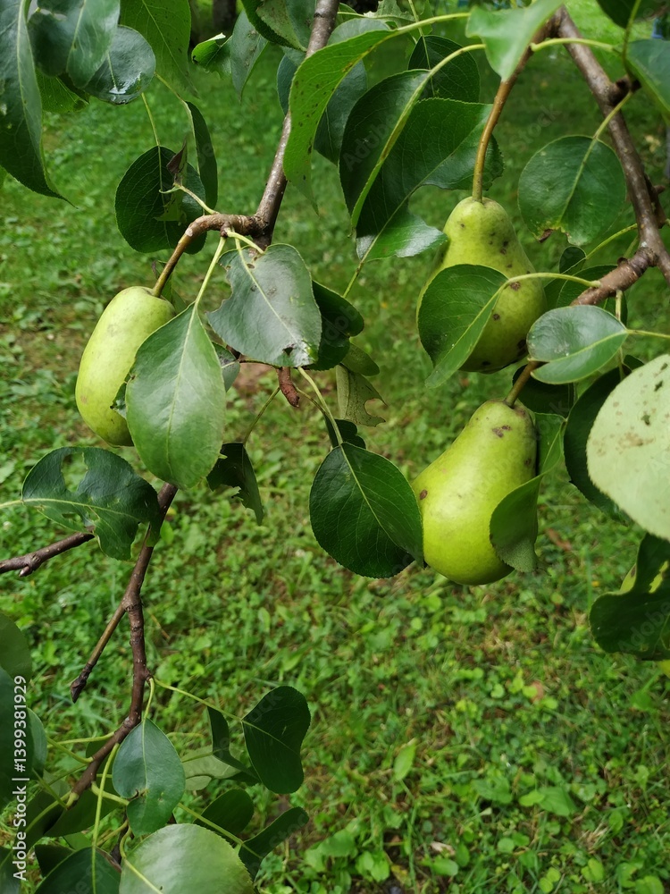 Ripe yellow pears hang on a tree branch. Pear orchard.